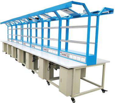 1、臺身部分:采用60mm*40mm(壁厚2mm)雙豎立柱方鋼組成的C型骨架,模具沖壓標準化連接件,表面經(jīng)純環(huán)氧樹脂塑粉高溫固化處理,具防酸堿、防腐蝕的特點、且承重。桌子的底部采用帶固定升降式腳墊,方便調(diào)整設(shè)備的擺放位置及高度。每工位帶鐵制柜(上部抽屜、下部柜門、帶鎖)1只