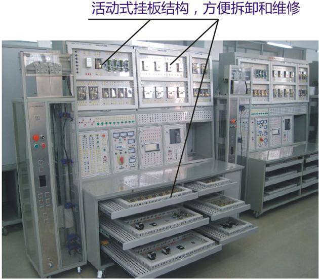 1、模型電梯設(shè)4層4站,由模擬井道架、轎廂、對(duì)重、曳引機(jī)、電梯門、門電機(jī)、各層站外呼盒及主要安全裝置組成,固定設(shè)置在實(shí)驗(yàn)臺(tái)側(cè)面。模擬井道架內(nèi)需配置用于檢測轎廂位置的樓層感應(yīng)器、平層感應(yīng)器(與實(shí)際電梯相似)等,其接線端子引至模擬井道架的插接孔上。井道架采用金屬材料為主體支架,有機(jī)玻璃封閉?!镌O(shè)備必須采用臺(tái)式結(jié)構(gòu),設(shè)置活動(dòng)式抽屜電氣板,每層抽屜板均設(shè)置有公共接線板(總線型接線方式,總線連接點(diǎn)數(shù)必須達(dá)到120點(diǎn)以上),抽屜電氣板之間采用工業(yè)坦克鏈連接,公共抽屜板連線采用真實(shí)電梯多芯隨行電纜。
