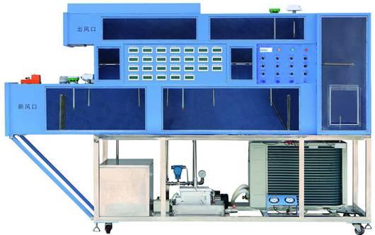 由一個模擬房間,和一個組合式風(fēng)柜組成。模擬房間采用30*30工業(yè)標準鋁型材和雙面烤漆木板結(jié)構(gòu),內(nèi)部裝有和真實空調(diào)末端同樣的風(fēng)機盤管,三級調(diào)速,由調(diào)整開關(guān)用戶自由調(diào)。組合式風(fēng)柜系統(tǒng)由回風(fēng)口,新空氣混合風(fēng)口,送風(fēng)機,中央空調(diào)蒸發(fā)器,管道,電磁閥組成。