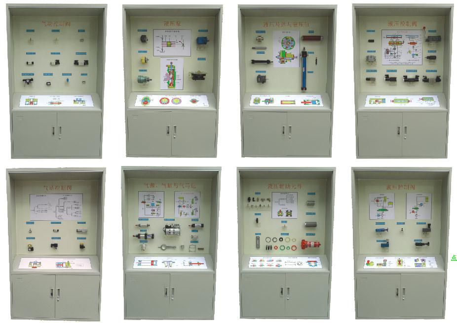 氣動(dòng)液壓元件陳列柜采用實(shí)物或模型以及必要的圖文資料展示常見(jiàn)液壓、氣動(dòng)元件的基本類型與基本結(jié)構(gòu)。氣動(dòng)液壓元件陳列柜每個(gè)模型都配備文字標(biāo)牌。