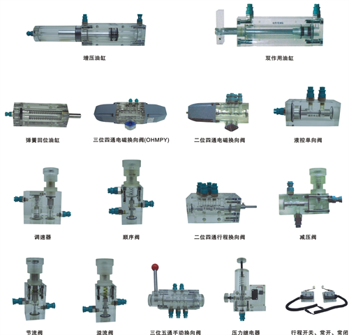 采用透明工藝加工而成,最大工作壓力2.0MPa。每個透明液壓元件皆配有底板,可方便、隨意地安放在操作面板上。油路搭接采用快換接頭,而且采用透明軟管,可清晰直觀看見油路的流動,不漏油。