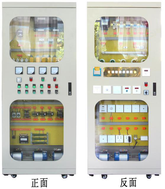 1、本裝置采用正反二面開門的離墻式威圖電氣控制柜,且正反面同時都可以操作,柜體中寬度能保證兩個學(xué)生同時合作接線實訓(xùn)的需要,其外形尺寸寬×厚×高分別為:800×600×2000 mm。柜體采用厚度為國標(biāo)1.5以上的優(yōu)質(zhì)鋼板,柜門采用厚度為國標(biāo)2.0以上的優(yōu)質(zhì)鋼板并安裝四塊大的玻璃,學(xué)生能通過玻璃看清柜內(nèi)各元器件及相應(yīng)的動作,金屬表面噴塑,柜體中間有二塊優(yōu)質(zhì)環(huán)氧樹脂絕緣板和相應(yīng)的支架系統(tǒng)隔離正反兩個柜體,安裝板上安裝智能建筑電氣控制線路各實訓(xùn)考核模塊。各元器件所有的接線端都連接至相應(yīng)的專用實訓(xùn)接線端子上,每個接線端上都套有用電腦打印接線端名稱及編號的套管,并且更換方便。被控制電機安裝于電氣控制柜內(nèi)。