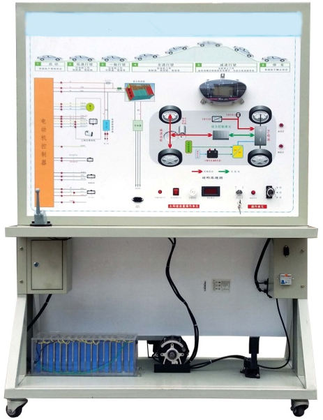 3、面板上安裝有點火開關、工況開關、油門踏板、擋位開關、制動開關、轉速表、電流指示表、太陽能裝置等,裝有一臺電機用來演示電動機的工作狀態(tài),及安裝太陽能充電板演示太陽能充電工況。