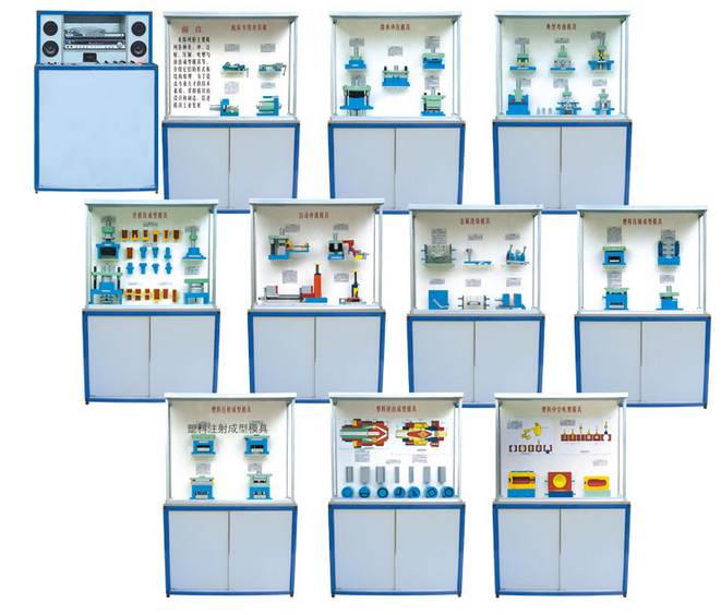 本公司力求實(shí)用根據(jù)學(xué)校教學(xué)要求需要、特制一套《冷沖壓與塑料成型工藝及模具設(shè)計(jì)》與《塑料成型模具》等教材設(shè)計(jì)而成的模具示教陳列柜,這套陳列柜共分十個(gè)柜, 具有多功能語(yǔ)音播放控制系統(tǒng)??捎蛇b控控制順序自動(dòng)講解,又能根據(jù)教材、教學(xué)需要而遙控任意選擇講解。柜體采用鋁木結(jié)構(gòu),堅(jiān)固美觀可靠,柜內(nèi)模型材料采用工程塑料制作,板面附有必要文字說(shuō)明,演示形象逼真,制作工藝美觀,使用本陳列柜提高教學(xué)效果,是一套現(xiàn)代化模具設(shè)計(jì)課程應(yīng)用陳列室設(shè)備。