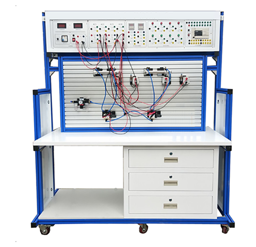 該氣動PLC控制綜合實訓裝置采用“平臺式設計、模塊化組合式應用”的新思路,氣動元件選用的工業(yè)級器件,力求做到真實、直觀,各氣動元件配有卡裝式快速裝接底板。學員根據(jù)所設計的氣動控制回路要求選用氣動元件,快速的通過專門設計的連接裝置可方便可靠的鎖緊在鋁合金實驗臺上,操作方便、簡捷。設備配置有常用氣動元件、可編程控制器模塊,電源模塊,按鈕模塊,時間繼電器模塊,繼電器模塊等器件,學生可獨立地進行氣壓回路設計、安裝、調(diào)試、故障排除、編制控制程序等操作實訓,從而提高學生的學習興趣、增強實踐動手能力、獨立思考問題和解決問題的能力。