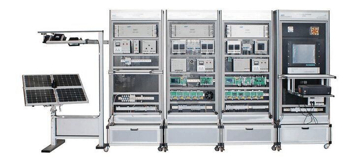 設備由光源模擬跟蹤裝置、光源模擬跟蹤控制系統(tǒng)、能量轉換控制存儲系統(tǒng)、離網逆變負載系統(tǒng)、監(jiān)控系統(tǒng)五個部分組成,各功能部分通過通訊電纜和連接電纜進行連接,形成一套能夠展示并動手設計、安裝、調試的太陽能光伏發(fā)電工廠應用的設備。