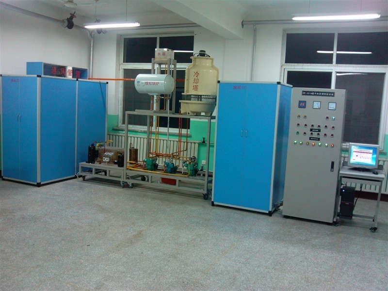 制冷機組、冷卻系統(tǒng)、冷凍系統(tǒng)、制熱系統(tǒng)、模擬客房、模擬大廳、電控柜、可編程控制器、壓力采集模塊、溫度采集模塊、數(shù)據(jù)采集點、PLC編程軟件、中央空調(diào)組態(tài)監(jiān)控軟件、計算機、小推車。